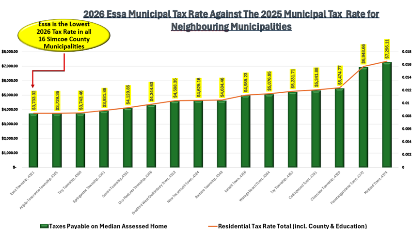 Essa is the lowest municipal tax rate among all 16 municipalities in Simcoe County.