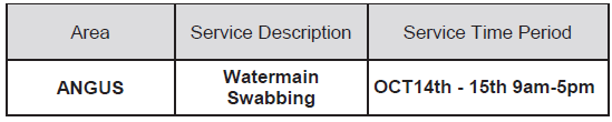 Please be aware that during watermain flushing and swabbing, residents may experience low to no water pressure and severe discoloration (brown / red) water, or perhaps even no water for the listed periods of time.