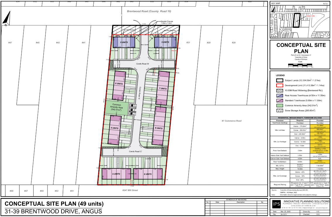 The proposed Official Plan Amendment would redesignate the lands from the existing Residential to Residential-Multiple. Additionally, the proposed Zoning By-law Amendment would rezone the lands from Residential, Low Density, Detached (R1) to Residential, Medium Density, townhome with Special Provisions (R3-XX). The proposed amendments would allow for the applicant to develop 8 townhouse blocks, with a total of 49 residential units. The development is designed to include a new private road off Brentwood Road (County Road 10) which will provide access to the site, unit driveways, as well as visitor parking spaces. The site plan displayed above represents a concept of the proposal.